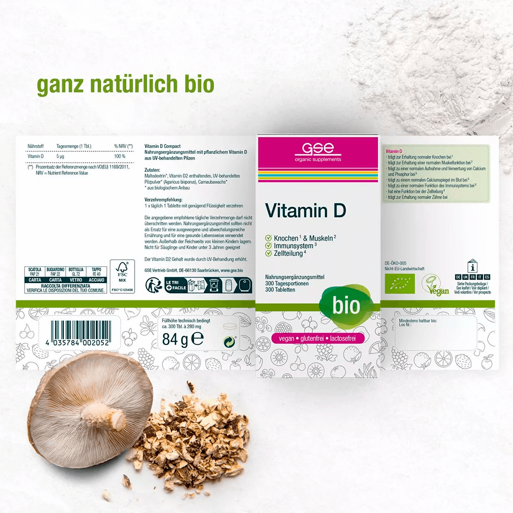 Als Hersteller natürlicher Nahrungsergänzungsmittel hat sich GSE für den Pilz Agaricus bisporus (auch bekannt als Zweisporiger Egerling) als Vitamin-D-Lieferanten entschieden – selbstverständlich aus zertifiziertem Bio-Anbau. Nur eine Tablette täglich versorgt den Körper mit 5 µg gut bioverfügbarem Vitamin D – z. B. im Herbst und Winter, bei überwiegendem Aufenthalt in geschlossenen Räumen, während Schwangerschaft und Stillzeit oder in fortgeschrittenem Alter. Die leicht zu schluckenden Tabletten sind vegan sowie laktose-, gluten-, soja- und gentechnikfrei.